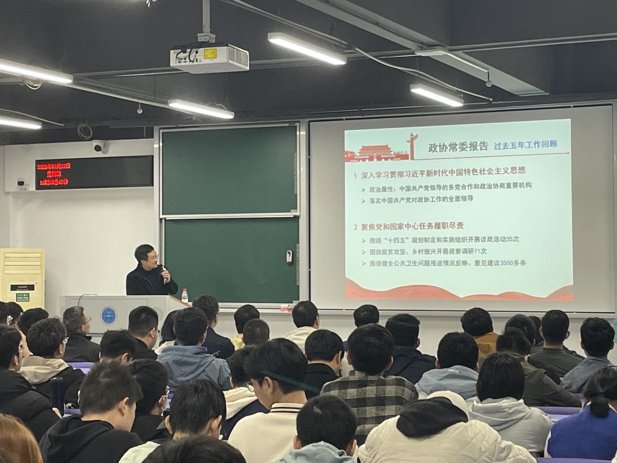 丁华锋对会议基本情况、政协常委报告关键点、政协换届选举情况、国务院机构改革方案进行介绍,从经济社会发展重点方面解读了政府工作报告,他还结合自身围绕探索“双元制”教学创新、大学生就业创业等教育、科技、人才领域焦点热点问题,介绍了自己参政议政履职情况。他深刻领会高质量发展是全面建设社会主义现代化国家的首要任务,教育、科技、人才是全面建设社会主义现代化国家的基础性、战略性支撑。他认为,要把好政治方向,密切关注党和国家重大问题;扎实开展调研,科学研究论证,发现真实问题,提出真知灼见;做好本职工作,围绕本职工作建言献策。他鼓励学院师生要牢记习近平总书记的重要讲话精神,深入学习贯彻全国两会精神,厚植爱国情怀,锤炼过硬本领,勇于干事创业,争做担当民族复兴大任的建设者和接班人。报告内容既具理论高度,又有实践维度,对全体师生深入学习贯彻全国两会精神具有非常重要的指导意义。