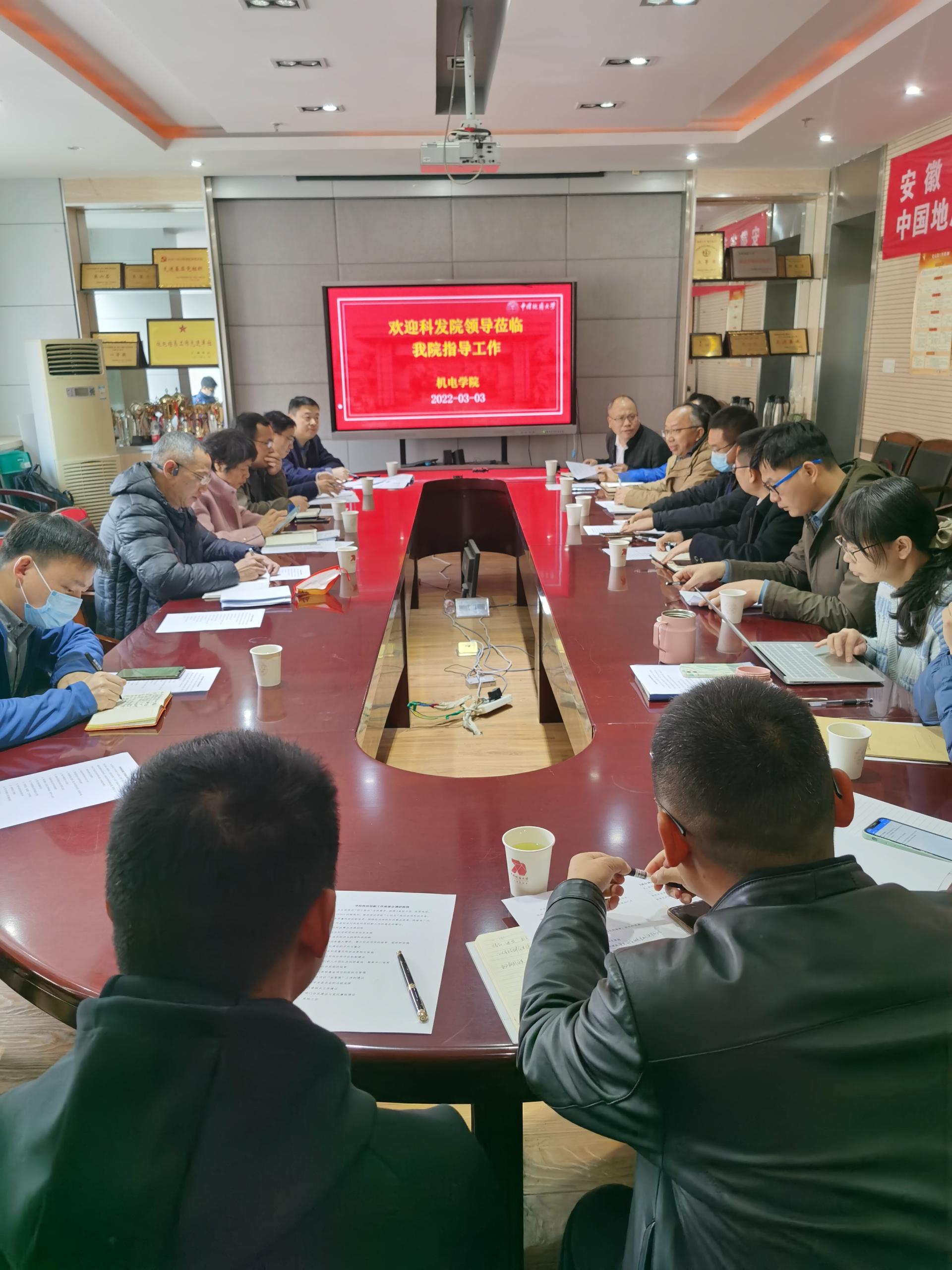 2022年3月3日上午,学校科学技术发展院常务副院长胡祥云一行莅临我院指导工作。学院党委书记瞿祥华、院长丁华锋、副院长罗杰、文国军、黄田野及各系教师代表参加调研座谈会,会议由罗杰副院长主持。