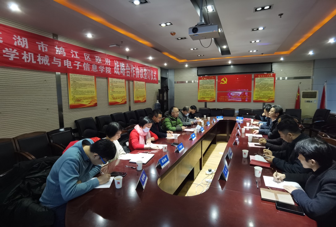 2022年01月12日下午,我院与芜湖市鸠江区人民政府代表在我校教二楼签订战略合作协议。XK星空体育党委书记瞿祥华、院长丁华锋等院班子成员及各系主任,鸠江区委组织部部长刘雪冬、鸠江区人社局局长肖宗明、鸠江区投资促进中心主任裴捷鸣、鸠江区委党校副校长马冰冰、鸠江区建投公司副总经理王孝国、鸠江区投资促进中心科员马成等出席签订仪式。会议由瞿祥华同志主持,丁华锋代表学院致欢迎辞。刘雪冬同志代表鸠江区人民政府表达与我院开展深入合作发展的热切愿望。此次会议是在2022年01月11日瞿祥华同志带队调研鸠江区返校后第二天举行。
